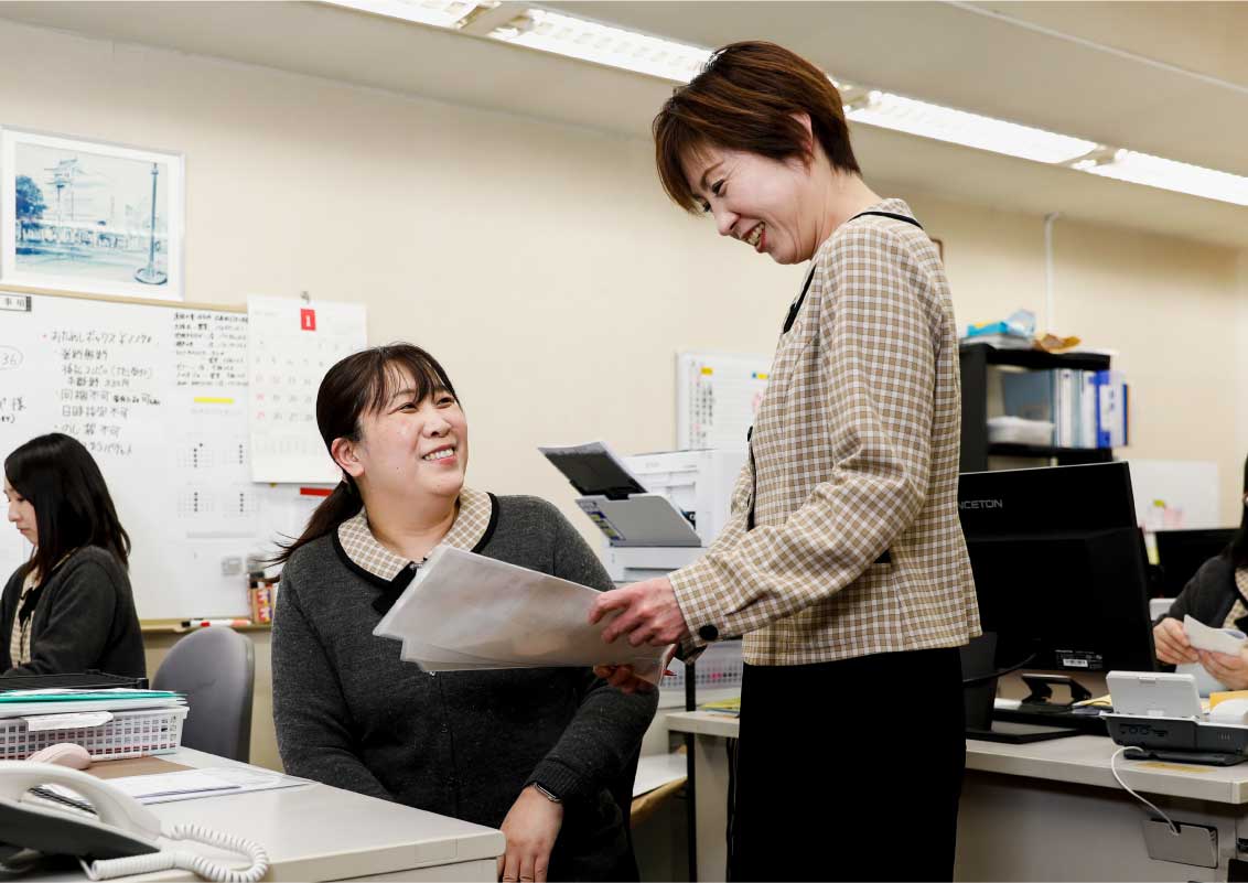 女性の割合が高いため、育児休業を取得する方がほぼ毎年います。子育てと仕事を両立できるよう、各種制度による支援に加えて、職場でのサポートも大切にしています。何でも相談しやすい体制を整えるとともに、休みを取りやすい雰囲気づくりにも取り組んでいます。対象となる社員の家庭の事情や要望を丁寧にヒアリングし、働き続けられる形を一緒に検討。必要に応じて部署異動を行ったり、育休延長制度の利用を提案したりすることもあります。お子さんが小さいうちは急な休みがあるのは当たり前というスタンスで、柔軟に対応できる環境を整備。長く働いていただくため、子育てだけでなく、傷病や親の介護など、さまざまなケースに寄り添った支援を今後も継続していきます。