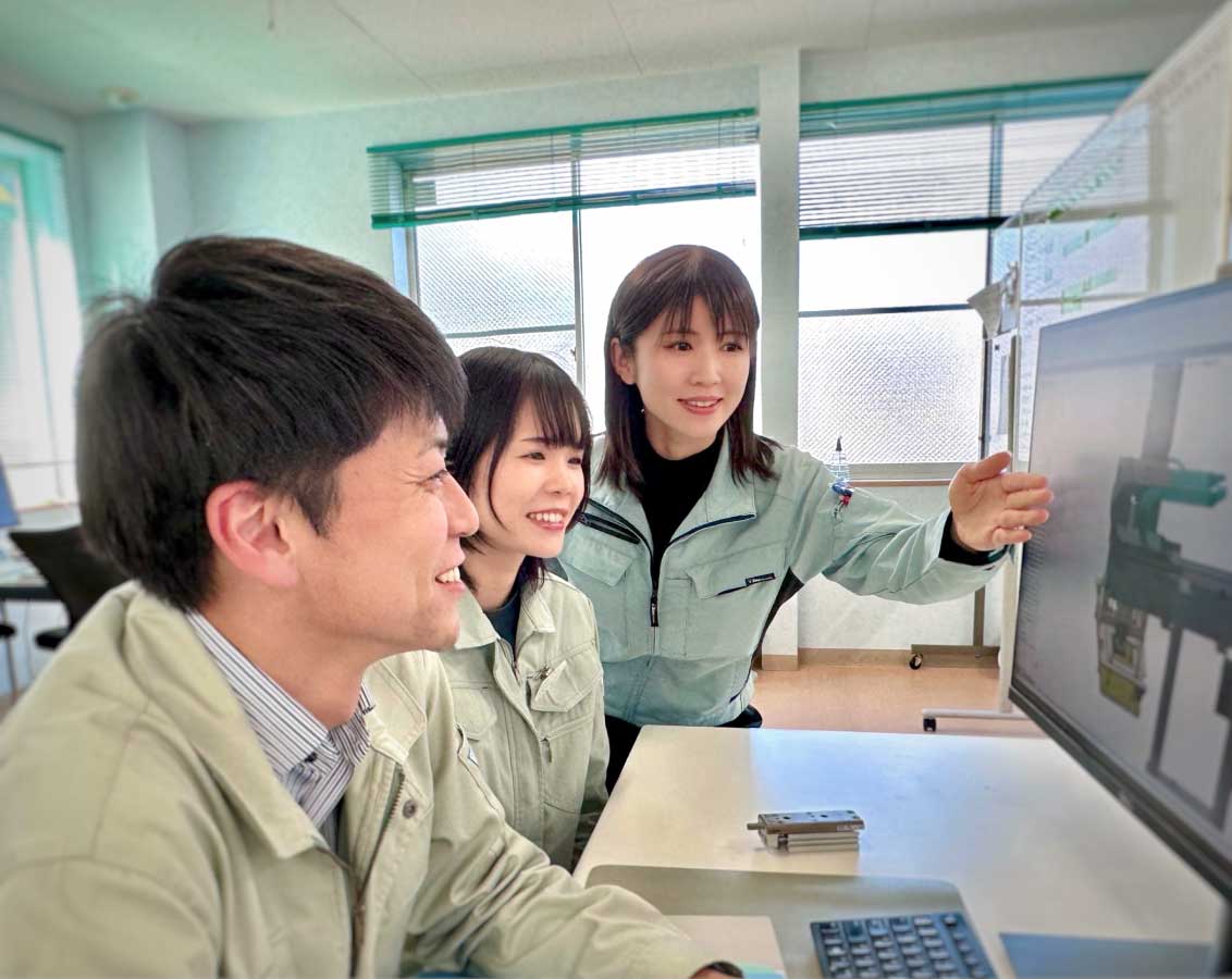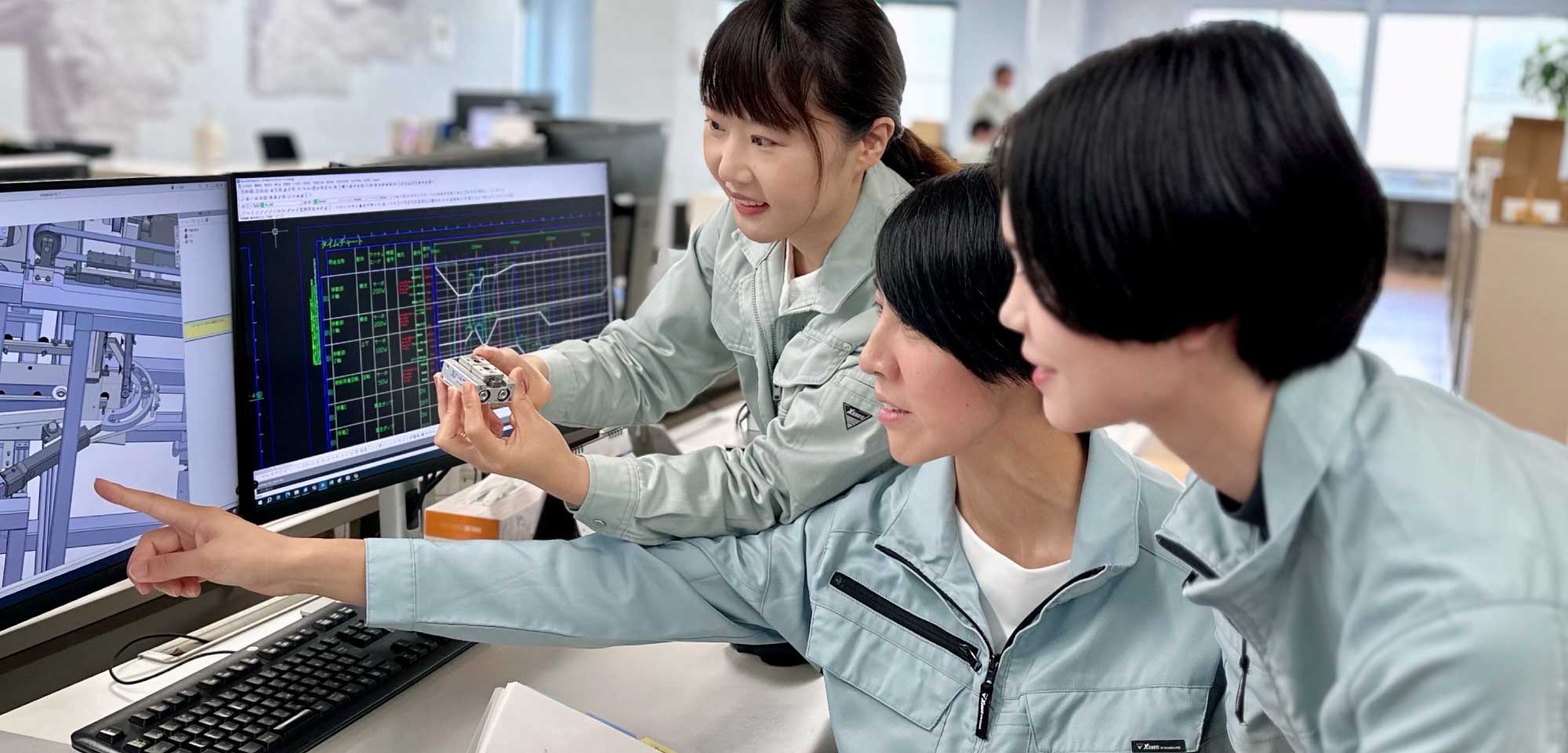家電製品や自動車部品、食品など幅広い業種で使われる自動省力化装置の設計製造を手がけています。女性や外国人が活躍し、若い人が働きやすい環境づくりのための積極的な取り組みは、人材確保にもつながっています。